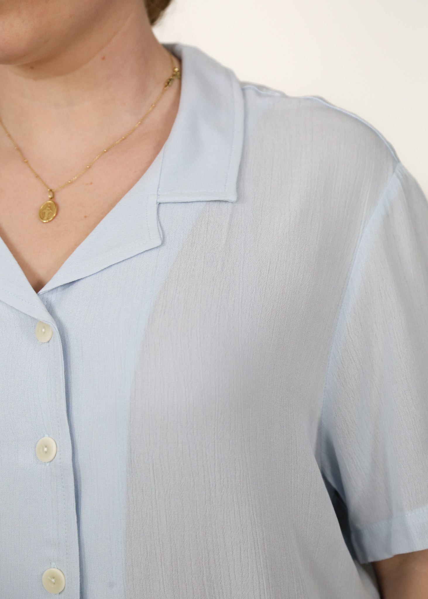 The SS Button Shirt from For Days is the most breathable button down in a beautiful light blue color. Made from eco-friendly materials, this button down is a guilt-free option to keep you cool.